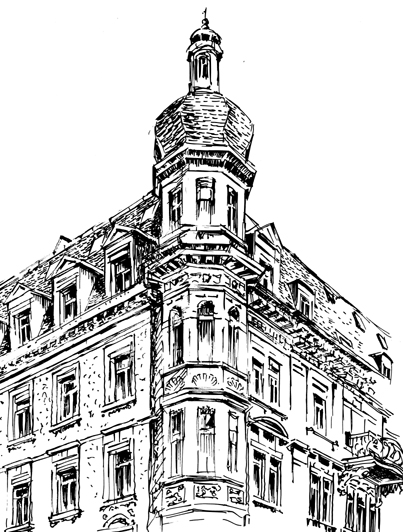 Die zwei mächtigen Türme mit den Ornamenten aus Sandstein zeugen von der Idee des Hauses